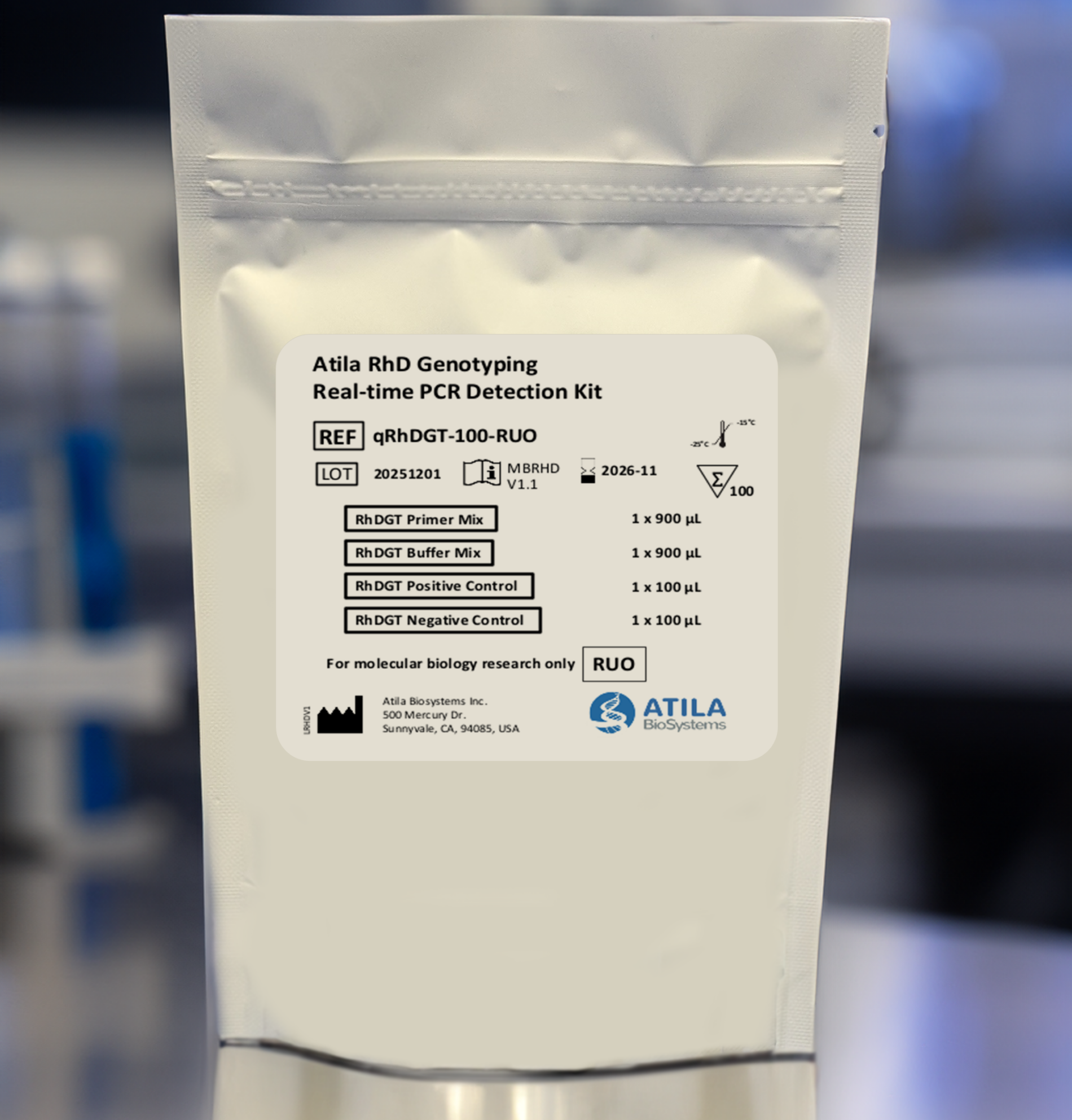 The Atila Rhesus D Genotyping Testing (RhDGT) Kit is for molecular biology research use only and tests for detecting the presence of RhD exon 4, exon 5 and exon 7 on chromosome 1 that indicates RhD positive blood type, or RhD exon 4 pseudogene form with a 38-bp insertion that indicates RhD negative blood type. The kit analyzes the genomic or cell free DNA obtained from the blood and applies the real-time qPCR platform to accurately identify exon 4, exon 4 pseudogene form, exon 5 and exon 7 on chromosome 1.