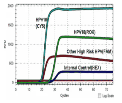 The ScreenFire HPV RS Kit is an isothermal nucleic acid amplification assay for the qualitative detection of high-risk types of human papillomavirus (HPV). High-risk HPV specific primers and fluorescent probes are used to amplify regions of viral genomic DNA including E6/E7 regions under isothermal conditions. The assay detects HPV types 16 alone, 18/45 as a group, 31/33/35/52/58 as a group (alpha-9 HPV group) and 39/51/56/59/68 (other high-risk HPV group) as a group.